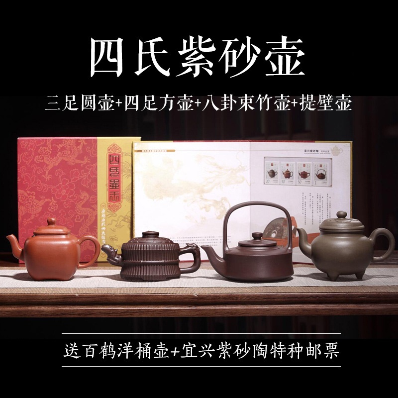 【宜兴紫砂壶】四氏紫砂壶套组(赠百鹤洋桶壶*1件+宜兴紫砂陶邮票册*1件)